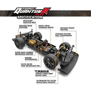 Don't be fooled, this on-roader still lives up to the Quantum's rugged nature with 4WD shaft drivetrain, independent double wishbone suspension, oil-filled adjustable aluminum coilover shocks and tough metal 4-gear differentials, all designed to deliver eye popping speed runs and bonkers donuts, tire shredding and slideways drift action!
